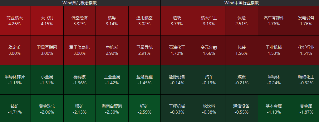 从板块看,商业航天再度上攻,保险、汽车零部件、多元金融等板块表现活跃,而贵金属、锂矿、通信设备等板块走低。