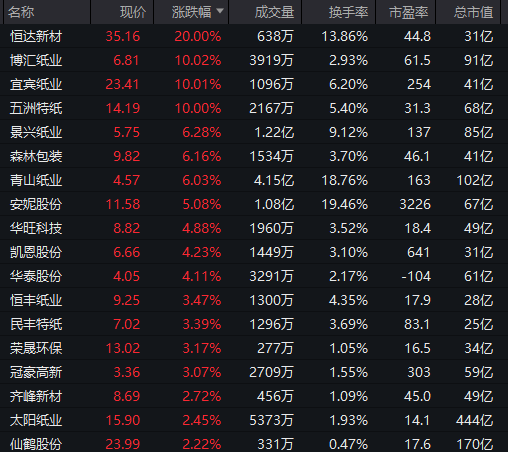 造纸板块震荡走高,恒达新材20%涨停,博汇纸业、宜宾纸业、五洲特纸纷纷涨停。